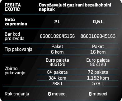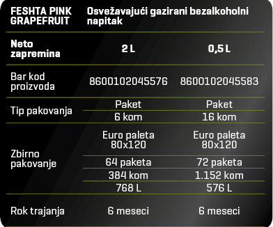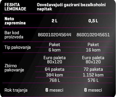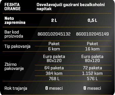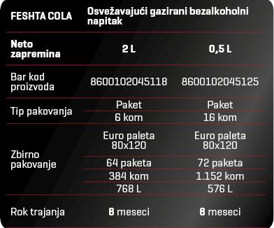 Feshta je gazirani napitak proizveden od najkvalitetnijih sirovina koje čine šećer izuzetnog kvaliteta, voćne arome i zdravstveno ispravna voda iz sopstvenog bunara sa najsavremenijom tehnološkom pripremom pre procesa gaziranja.